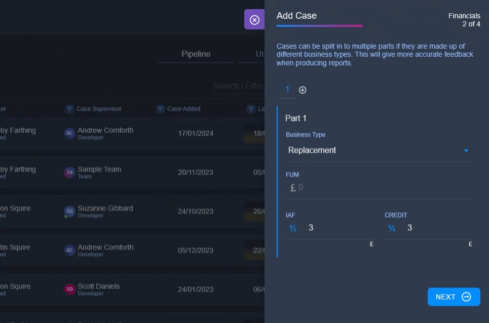 When you are setting up a workflow you are presented with a list of business types from which you can select multiple options of which business types can be assigned to a case. When a user is setting up a case they have the option of adding multiple case financial parts with different business types for each.