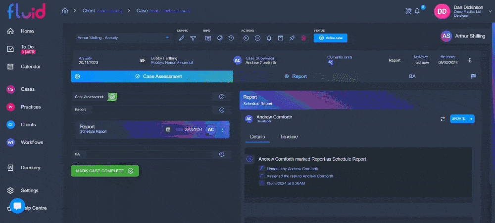 The case timeline enables you to see everything that case been done on a case since it's creation, in a neatly sorted list. This will give you each time a task was actioned with the date and time this happened.